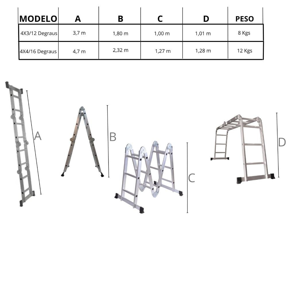 Escada Multiuso: Versatilidade e Segurança em um Único Produto Desenvolvida para Atender Suas Necessidades A Escada Multiuso é fabricada em alumínio de alta qualidade, garantindo uma estrutura compacta e fácil de transportar. Sua super resistência de até 150 kg proporciona segurança em cada degrau. Com pés de borracha que não deslizam, dobradiças de aço e travas de segurança, você pode confiar na estabilidade deste produto. Versatilidade para Profissionais e para o Uso Doméstico Esta escada versátil e multifuncional oferece diferentes posições para se adequar às suas necessidades, seja no ambiente profissional ou doméstico. Cuide da sua segurança e evite subir em cadeiras e banquinhos improvisados, utilize uma escada projetada para oferecer segurança e estabilidade em todas as situações. Medidas para Diferentes Usos: - Altura Esticada: 3,55 m - Altura Aberta (Posição de Pintor): 1,70 m - Altura no Modo Andaime: 0,88 cm - Altura Fechada para Transporte: 0,96 cm - Peso: 8 kg - Suporta: 150Kg Com sua capacidade de suportar até 150 kg, esta Escada Multiuso é a escolha ideal para qualquer tarefa, garantindo segurança e praticidade em cada uso.